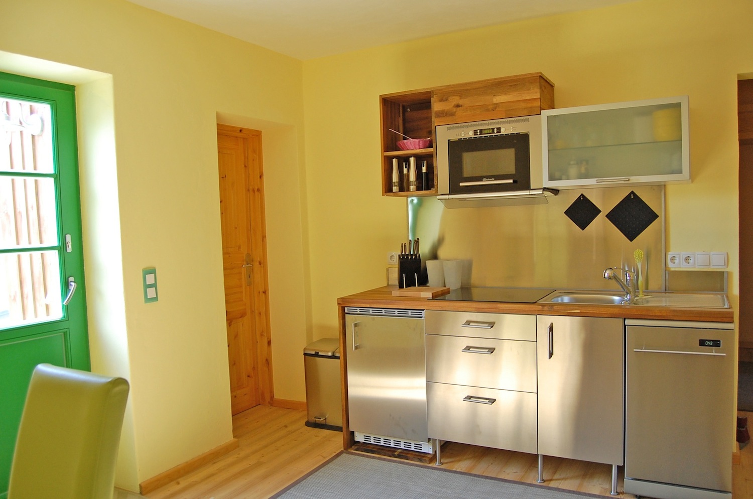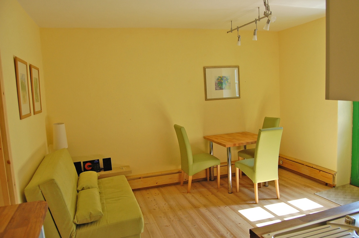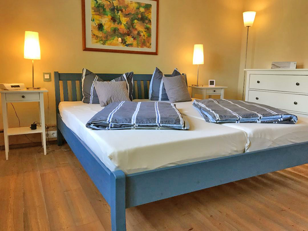 Die etwa 50 qm große Ferienwohnung im Erdgeschoss ist für zwei(!) Erwachsene geeignet (evtl. Aufbettung für ein Kind bis höchstens 16 Jahre, gegebenenfalls kostenpflichtig). Sie verfügt über ein geräumiges Schlafzimmer mit allergikerfreundlichen Marken-Matratzen und Daunenbetten, ein ansprechendes Esszimmer mit Küchenzeile und Vollausstattung, ein komfortables Duschbad sowie einen Wohnungsflur mit zusätzlicher Kleider- und Kofferablage. Zur geschmackvollen Ausstattung zählen eine Edelstahlküche mit Ceranfeld, Mikrowelle, Kühlschrank und Geschirrspüler.