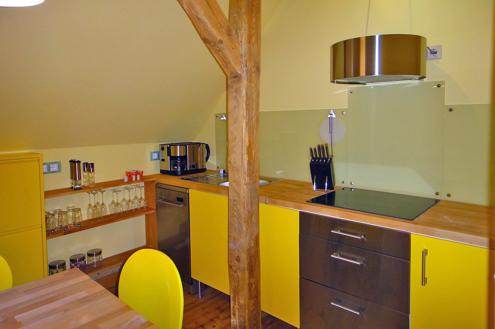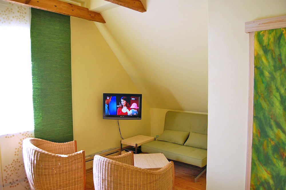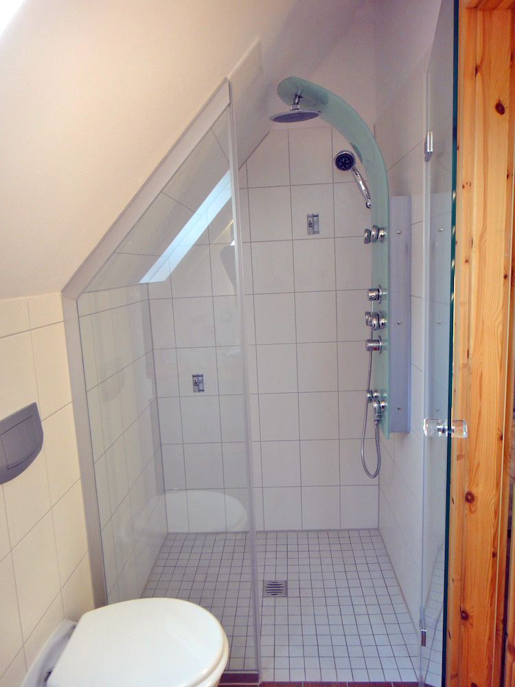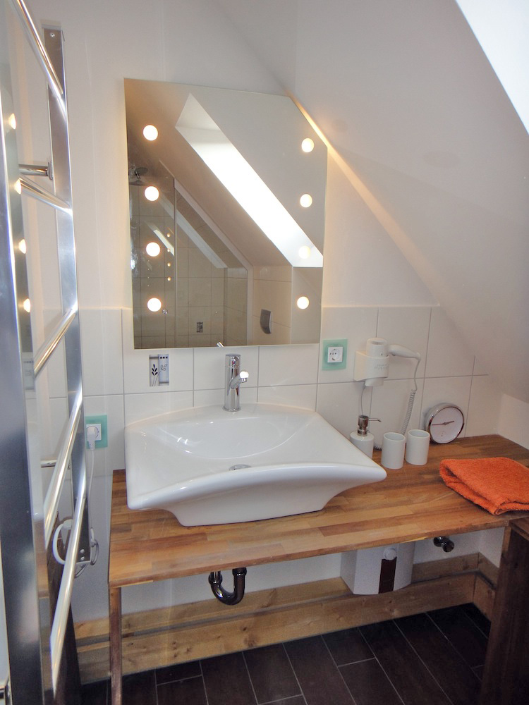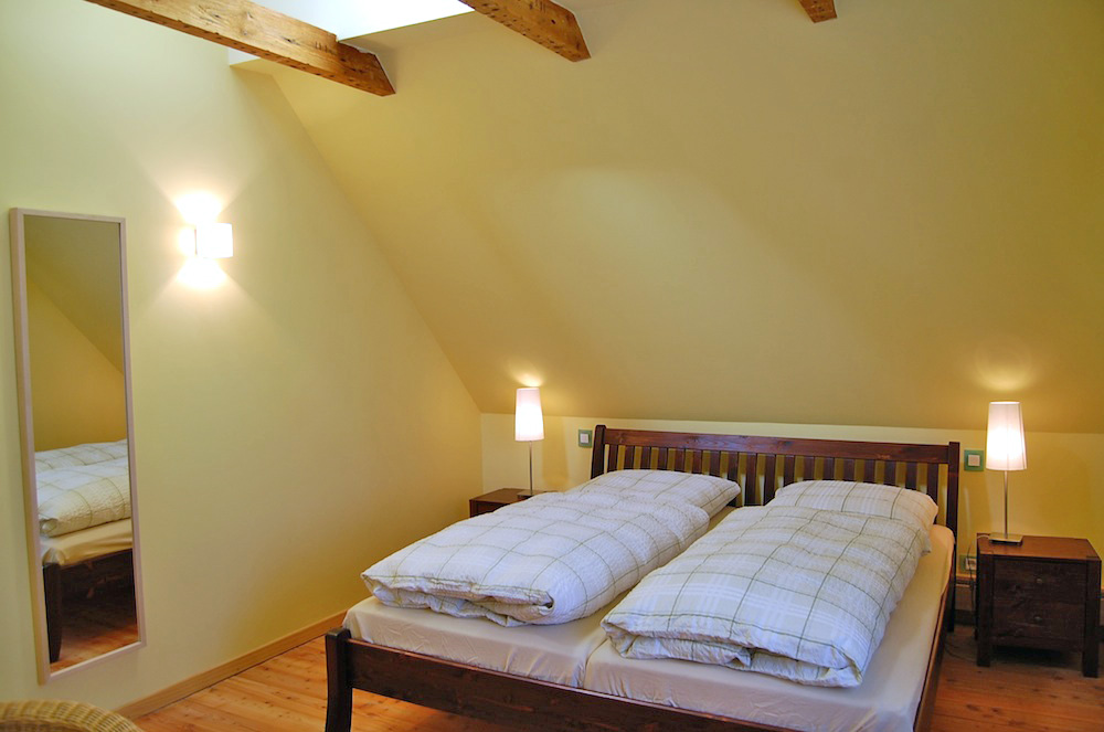 Lieben Sie das "Kuschelige", das "Heimelige", das "Ungewöhnliche"? Dann kommen Sie zu uns in die "SommerFrische". Die architektonisch interessante etwa 30qm große Ferienwohnung im Obergeschoss ist für zwei Personen geeignet (Aufbettung leider nicht möglich). Sie verfügt über einen kombinierten, sich bis zur Dachspitze öffnenden Schlaf-/Aufenthaltsraum mit Sat-HD-TV, HiFi-DAB+-Stereoanlage, WLAN und begehbarem Kleiderschrank mit Tresor. Das 180 cm breite Doppelbett bietet mit Markenmatratzen ("Emma") und Topper besten Schlafkomfort. Der separate, offene Eingangs- und Küchenbereich ist mit Essecke, Ceranfeld, Mikrowelle, Kühlschrank, Geschirrspüler, Kaffeemaschine, Toaster und Wasserkocher ausgestattet. Auf den Böden sind massive Holzdielen verlegt. Ein kleines, schmuckes Duschbad mit WC, Handtuchtrockner und Hotelföhn vervollständigt dieses maßgeschneiderte Urlaubsangebot für Individualisten.